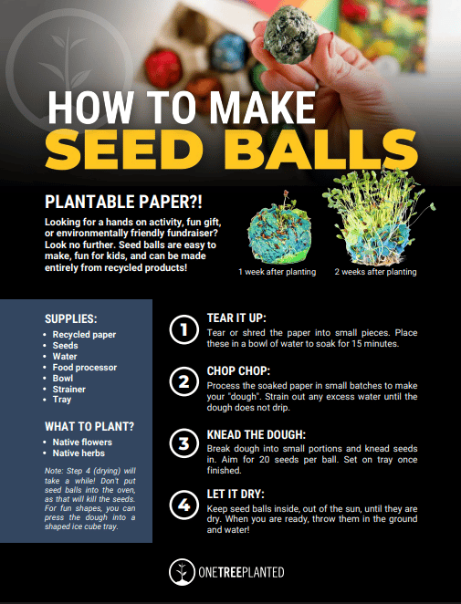 A great, hands-on craft to do with your kids, seed balls are also a valuable teaching tool for budding naturalists. Using native wildflower seeds and recycled paper, this activity will get your kids excited about gardening in a whole new way! Download this step-by-step "How to Make Seed Balls" Guide from One Tree Planted to get all the details on how to combine wildflower seeds with moist paper to create plantable balls. Once you've built up a cache, it's time for the really fun part: dispersal!